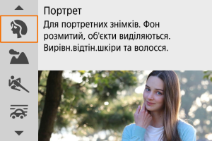 Режим [] (Портрет) дає змогу розмити тло, щоб виділити зображення людини. Окрім того, у цьому режимі тони шкіри й волосся виглядають м’якшими.