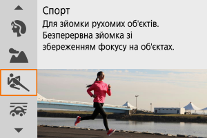 Для зйомки рухомого об’єкта, наприклад людини, що біжить, чи автомобіля, що їде, використовуйте режим [] (Спорт).