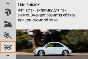 - Визначений рівень ефекту панорамування може не застосовуватися під час зйомки при яскравому освітленні (наприклад, у сонячні літні дні) або під час зйомки повільних об’єктів.