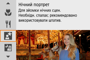 Використовуйте режим [] (Нічний портрет) для яскравих, красивих знімків людей на фоні нічних сцен. Зверніть увагу, що під час зйомки в цьому режимі необхідно застосовувати вбудований спалах або спалах Speedlite. Рекомендується використовувати штатив.