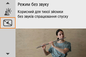 Коли потрібна тиша, можна знімати без звуків спуску затвора або інших звукових сигналів. Під час зйомки на екрані на мить відображається біла рамка.