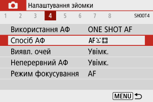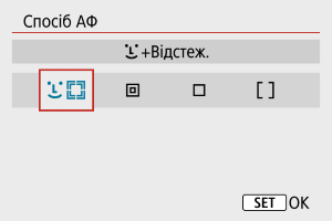 +Відстеж.] установлюється автоматично. Інструкції з вибору способу АФ див. в розділі Вибір способу АФ.