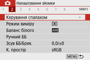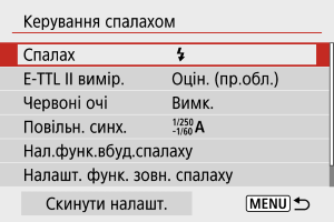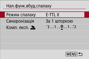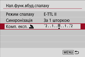 Функції вбудованого спалаху чи зовнішніх спалахів Speedlite серії EL/EX можна встановити з екранів меню камери.