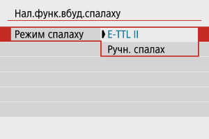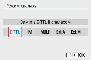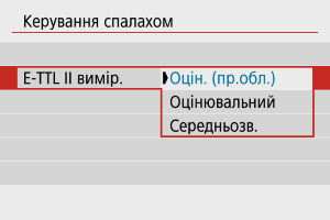 Установіть значення [E-TTL II], щоб знімати в повністю автоматичному режимі спалаху E-TTL II/E-TTL.