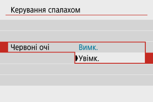 Перед зйомкою зі спалахом установіть значення [Увімк.], щоб зменшити ефект червоних очей за допомогою лампи зменшення ефекту червоних очей.