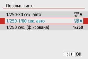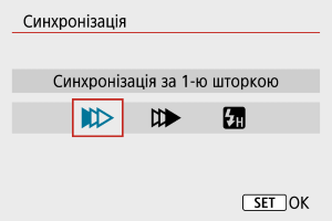 Зазвичай слід установлювати значення [За 1 шторкою], яке передбачає спрацьовування спалаху відразу після початку зйомки.