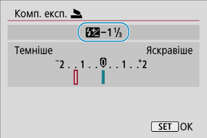 Налаштуйте компенсацію експозиції для зйомки зі спалахом, якщо яскравість об’єкта не відповідає очікуваній (тобто потрібно відрегулювати потужність спалаху). Компенсацію експозиції для зйомки зі спалахом можна встановити в межах ±2 ступенів із кроком 1/3 ступеня.