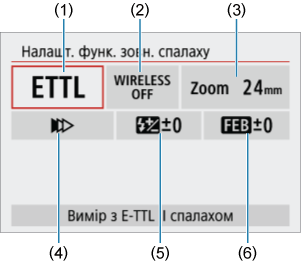 Інформація, що відображається на екрані, розташування дисплея та доступні параметри залежать від моделі зовнішнього спалаху Speedlite, його параметрів користувацьких функцій, режиму спалаху й інших факторів. Докладніше про функції спалаху див. в інструкції з його використання.