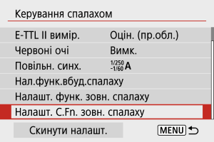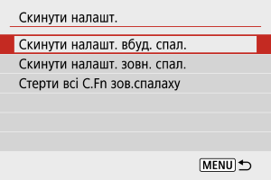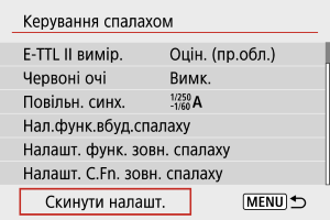 - Виберіть [Скинути налашт. вбуд. спал.], [Скинути налашт. зовн. спал.] або [Стерти всі C.Fn зов.спалаху].