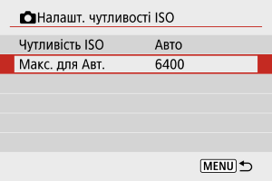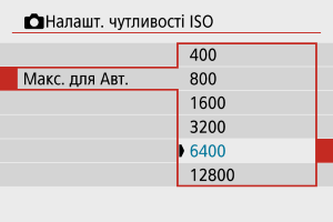 У режимі автоматичного вибору чутливості ISO можна встановити максимальну чутливість ISO в межах ISO 400–12800.