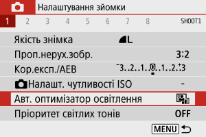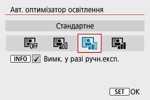 - Якщо ефект від функції Auto Lighting Optimizer (Автоматичний оптимізатор освітлення) занадто сильний і зображення вийшло не надто яскравим, установіть значення [Низьке] або [Вимк.].