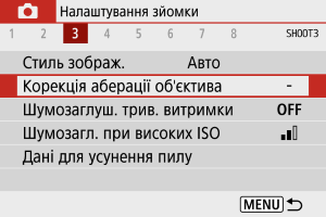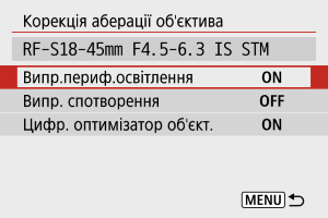 - Якщо використовується об’єктив іншого виробника (не Canon), для функцій корекції рекомендується встановлювати значення [Вимк.], навіть коли відображається повідомлення [Є дані корекції].