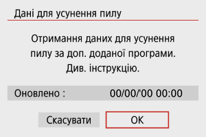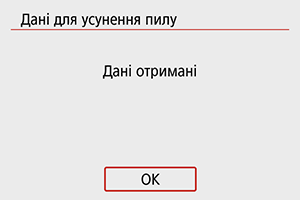 Коли дані для усунення пилу буде отримано, вони додаватимуться до фотографій, знятих після цього. Рекомендовано отримувати дані для усунення пилу до початку зйомки.