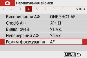 : Режим фокусування] не відображається, коли положення фокуса знаходиться в діапазоні, де застосовується виключно ручне фокусування (MF). Повертайте кільце фокусування в бік нескінченності (за годинниковою стрілкою, якщо дивитися з боку передньої частини камери), щоб переміщувати положення фокуса, доки не з’явиться параметр [