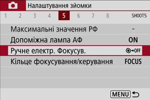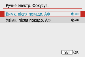 Якщо використовуються об’єктиви з ручним електронним фокусуванням, можна вказати, як використовуватиметься ручне коригування фокуса в режимі покадрового АФ.