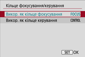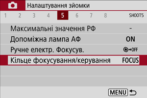 Перемикання функцій кільця фокусування / керування об’єктива за допомогою меню.