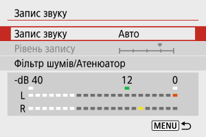 - У режимах основної зони для параметра [Запис звуку] доступні значення [Увімк.] і [Вимк.]. Для автоматичного регулювання рівня запису установіть значення [Увімк.].