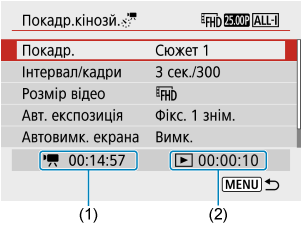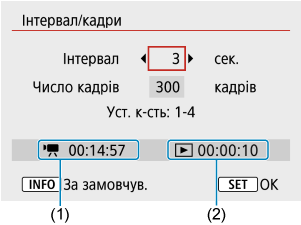 Вказує тривалість запису (час, потрібний для відтворення) покадрової зйомки відео з якістю 4K або Full HD з фотографій, зроблених із заданими інтервалами.