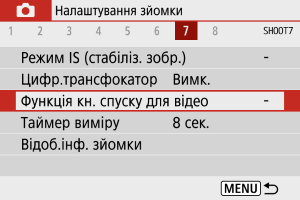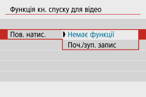 Якщо для параметра [Пов. натис.] установлено значення [Поч./зуп. запис], ви можете починати або зупиняти записування відео, натискаючи кнопку зйомки відео, натискаючи кнопку затвора повністю, а також використовуючи бездротовий пристрій дистанційного керування BR-E1 або дистанційний перемикач RS-60E3 (продаються окремо).