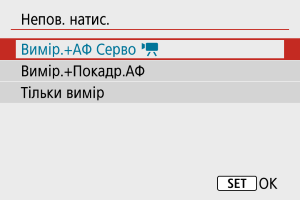 - Якщо для параметра [Непов. натис.] установлено значення [Вимір.+Покадр.АФ], воно зміниться на [Вимір.+АФ Серво