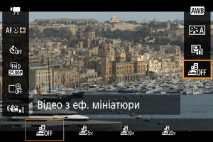 Можна записувати відео з ефектом мініатюри, на яких розмито області зображення за межами вибраної ділянки. Також перед зйомкою можна вибрати швидкість відтворення, щоб записувати відео, які створюють враження мініатюрних сцен з людьми й об’єктами, що швидко рухаються. Зауважте, що звук не записується.