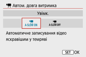 Можна вибрати, чи потрібно записувати світліші відео, ніж зі встановленим значення [Вимк.], за рахунок автоматичного подовження витримки за недостатньої освітленості.