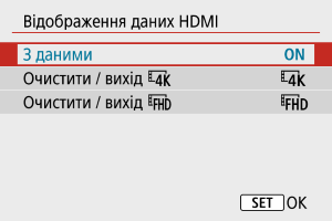 Через HDMI на іншому пристрої відображаються зображення, параметри зйомки, точки АФ та інша інформація. Зверніть увагу, що екран камери вимикається. Записані відео зберігаються на карту пам’яті.