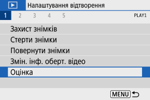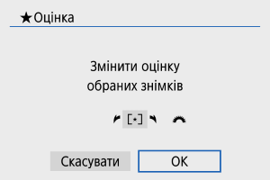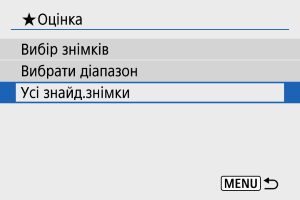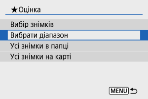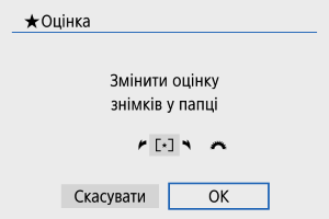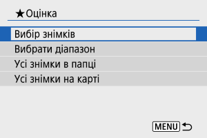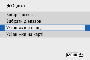 : Оцінка] встановити значення [Усі знімки в папці] або [Усі знімки на карті], будуть оцінені всі зображення в папці або на карті пам’яті.