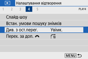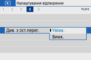 - [Увімк.]: відтворення відновлюється з останнього показаного зображення (крім випадків, коли зйомку було щойно завершено).