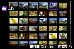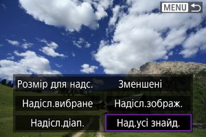 Надсилайте одночасно всі зображення, які відповідають умовам пошуку, заданим у меню [Встан. умови пошуку знімків]. Докладніше про параметр [Встан. умови пошуку знімків] див. в розділі Установлення умов пошуку зображень.