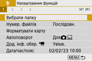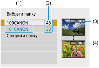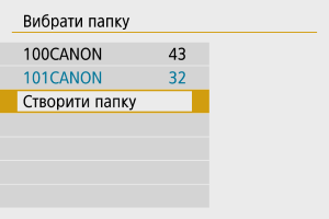 - Папка може містити до 9999 зображень (номери файлів від 0001 до 9999). Коли папка заповнюється, автоматично створюється нова з порядковим номером, більшим на один. Крім того, у разі виконання скидання вручну () нова папка створюється автоматично. Можна створювати папки з номерами від 100 до 999.