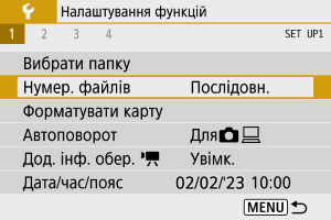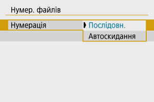 Зробленим знімкам, які зберігаються в папці, призначаються номери файлів від 0001 до 9999. Можна змінити спосіб нумерації файлів зображень.