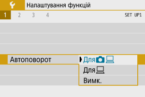 - Зображення, які було знято зі встановленим значенням [Вимк.] параметра автоматичного повертання, не повертатимуться під час відтворення, навіть якщо згодом для автоматичного повертання буде встановлено значення [Увімк.].