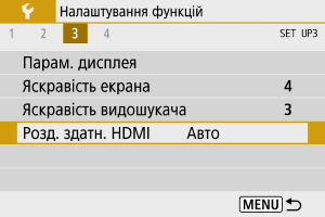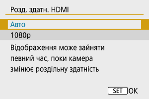 Установіть вихідну роздільну здатність зображення, яка використовується за підключення камери до телевізора або зовнішнього пристрою записування через HDMI-кабель.