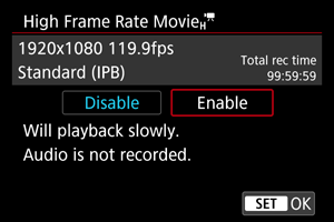 When High Frame Rate is set to [On], the camera can capture 119.88/100.00 fps to record movie files with a frame rate of 29.97/25.00 fps.
