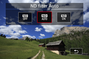 For optimal brightness in the scenes you shoot, Auto ND filter reduces light intensity to 1/8 the actual level, by an amount equivalent to three stops. Besides [Auto] (only in movie recording), you can also select [Off] or [On].