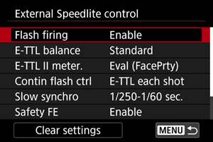 • Select [Clear flash settings] or [Clear all Speedlite C.Fn's].