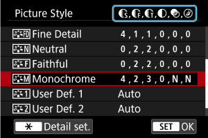You can customize any Picture Style by changing it from the default settings. For details on customizing [Monochrome], see Monochrome Adjustment.