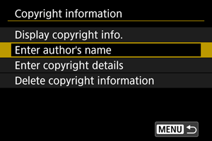 • If the entry for “Author” or “Copyright” is long, it may not be displayed entirely when you select [Display copyright info.].
