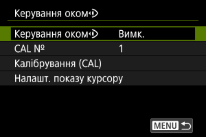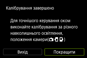 Процес реєстрації характеристик лінії вашого погляду для точного виявлення руху очей камерою під час зйомки через видошукач називається калібруванням. Калібрування забезпечує вищу точність керування оком.