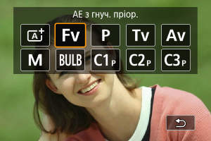 Коли встановлено режим [Fv], подібний до [P] або [Av], зйомка з повільною синхронізацією не використовується за слабкого освітлення, навіть якщо для параметра [Повільн. синх.] на вкладці [