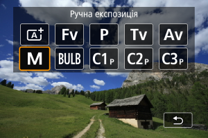 - Будь-яка наявна величина корекції експозиції зберігається, якщо перейти в режим [M] з автоматичним вибором чутливості ISO після використання корекції експозиції в режимі [P], [Tv] або [Av] ().