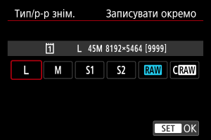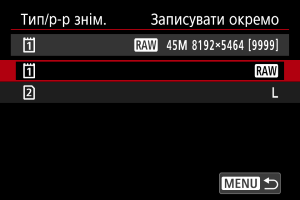- Щоб записувати на кожну карту знімки з різними значеннями якості зображення (наприклад, зображення у форматах RAW і JPEG), установіть для параметра [Опц. запису