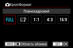 Якщо використовується об’єктив RF або EF, можна змінити формат знімків перед зйомкою. Можна використовувати варіант [1,6x (кроп-фактор)], щоб знімати з ефектом телеоб’єктива, оскільки він збільшує центральну частину зображення (область, еквівалентна формату APS-C).
