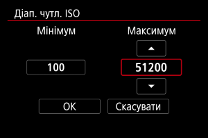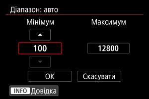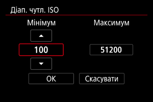 Можна встановити діапазон ручного настроювання чутливості ISO (мінімальне й максимальне значення).