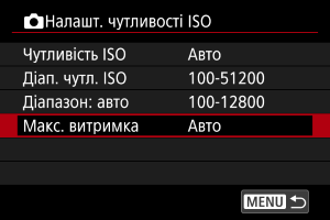 Щоб запобігти автоматичному встановленню задовгої витримки, для автоматичної чутливості ISO можна встановити максимальну витримку.
