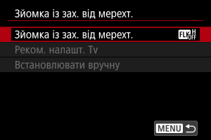 - Перед зйомкою із захистом від високочастотного мерехтіння може бути доцільно встановити для параметра [