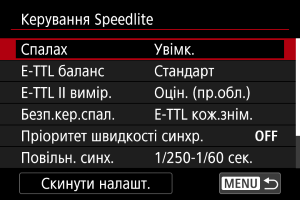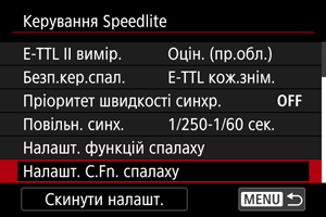 - Скидання параметрів функцій спалаху/Скидання всіх користувацьких функцій Speedlite
