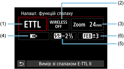 Інформація, що відображається на екрані, розташування індикаторів і доступні параметри залежать від моделі зовнішнього спалаху Speedlite, налаштувань його користувацьких функцій, режиму спалаху й інших факторів. Докладніше про функції спалаху Speedlite див. в інструкції з використання спалаху Speedlite.