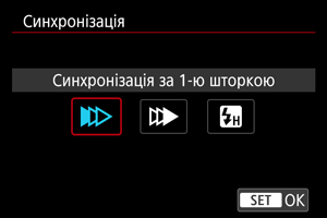 За звичайних обставин встановлюйте для цього параметра значення [Синхронізація за 1-ю шторкою], яке передбачає спрацьовування спалаху відразу після початку зйомки.